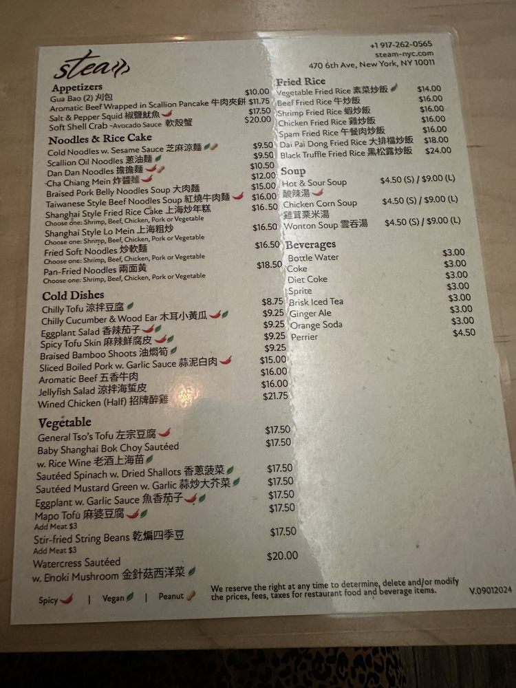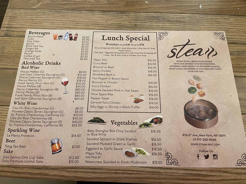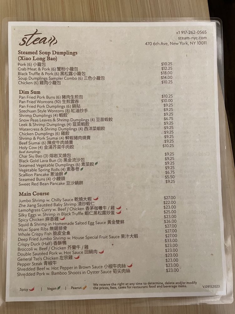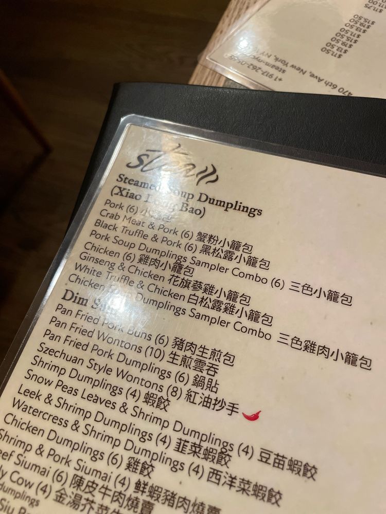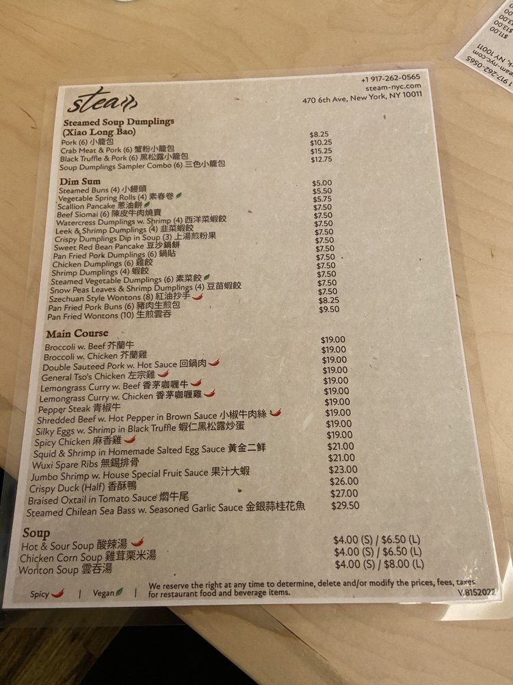 Introducing the menu at Steam - Shanghai Asian Fusion, located on 6th Ave in New York City. This trendy restaurant offers a variety of Asian fusion dishes with a focus on Shanghai cuisine. The menu features a wide range of options, from traditional pork Xiao Long Bao soup dumplings to innovative creations like black truffle and crab meat variations. Customers rave about the quality and flavor of the soup dumplings, highlighting them as a must-try dish. Other popular items include the pan-fried pork dumplings and Szechuan-style wontons. The restaurant's cozy interior and friendly staff create a welcoming atmosphere for diners. With a diverse menu, attentive service, and standout dishes, Steam - Shanghai Asian Fusion is a top choice for those looking to explore authentic and delicious Asian cuisine in the heart of NYC.