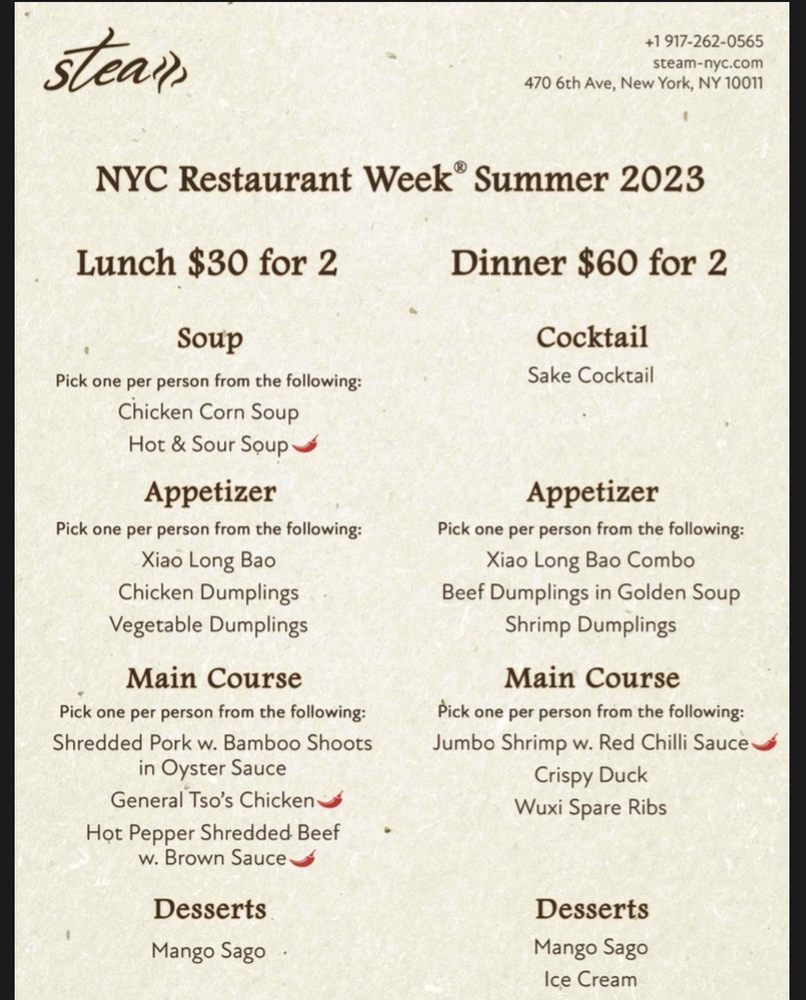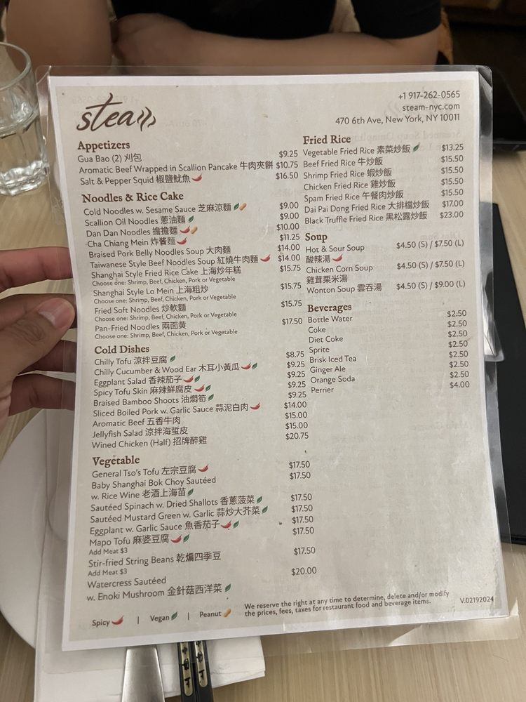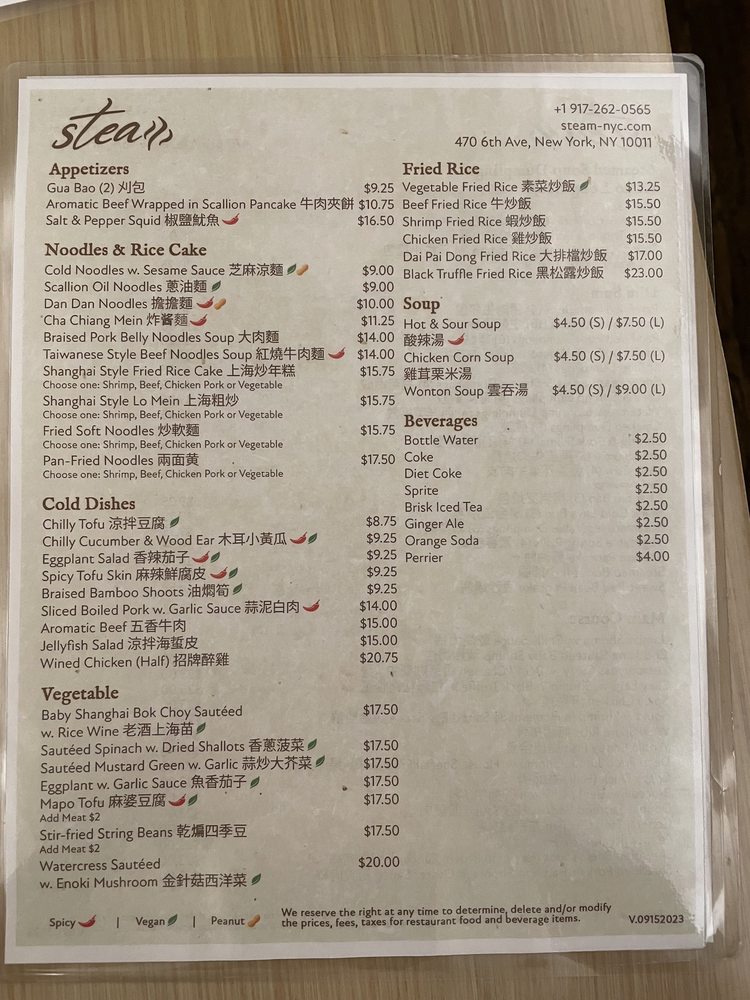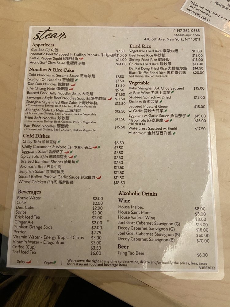 Introducing the menu at Steam - Shanghai Asian Fusion, located on 6th Ave in New York City. This trendy restaurant offers a variety of Asian fusion dishes with a focus on Shanghai cuisine. The menu features a wide range of options, from traditional pork Xiao Long Bao soup dumplings to innovative creations like black truffle and crab meat variations. Customers rave about the quality and flavor of the soup dumplings, highlighting them as a must-try dish. Other popular items include the pan-fried pork dumplings and Szechuan-style wontons. The restaurant's cozy interior and friendly staff create a welcoming atmosphere for diners. With a diverse menu, attentive service, and standout dishes, Steam - Shanghai Asian Fusion is a top choice for those looking to explore authentic and delicious Asian cuisine in the heart of NYC.